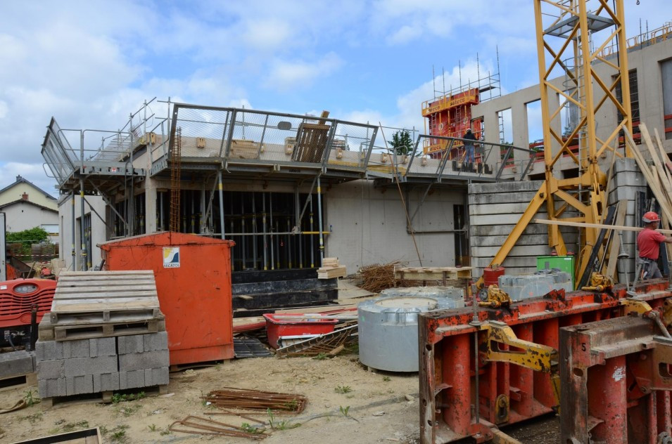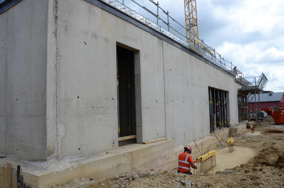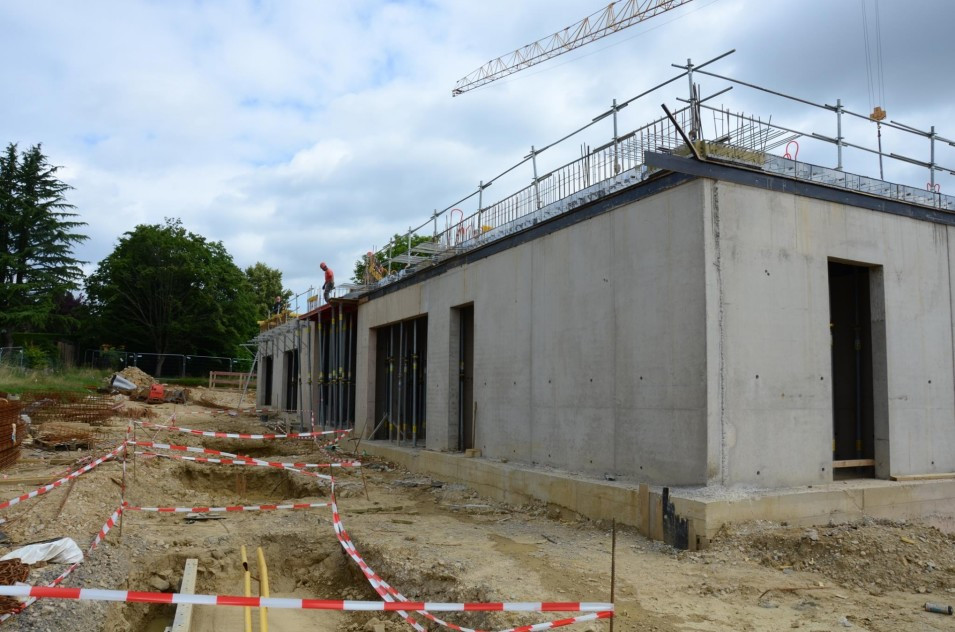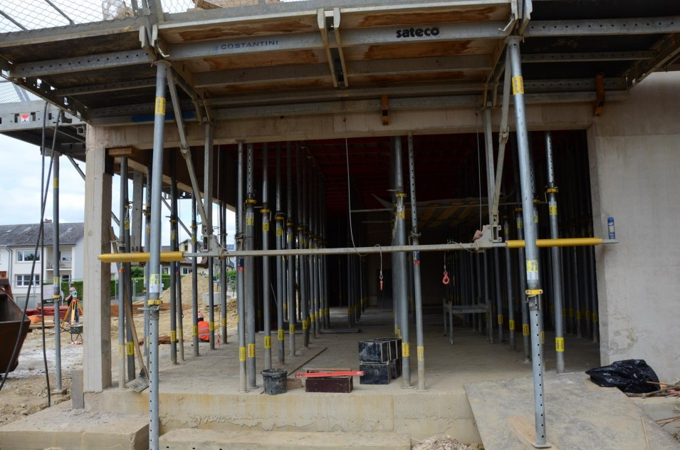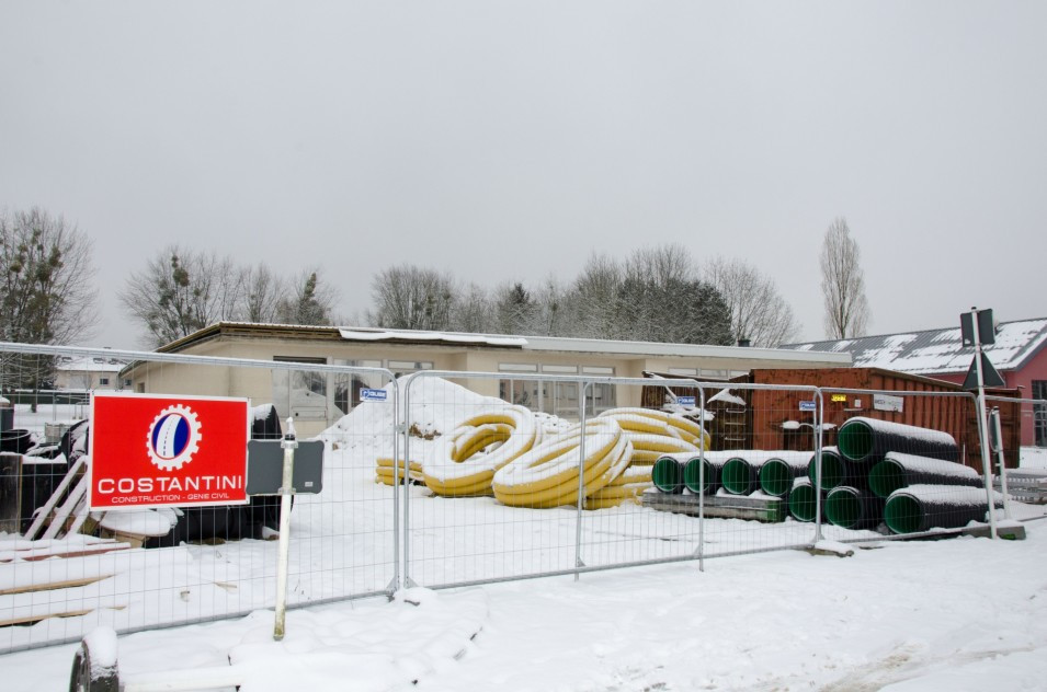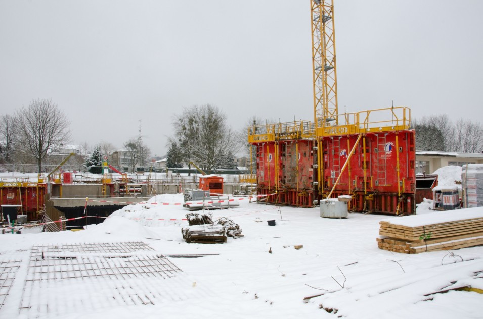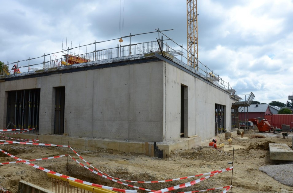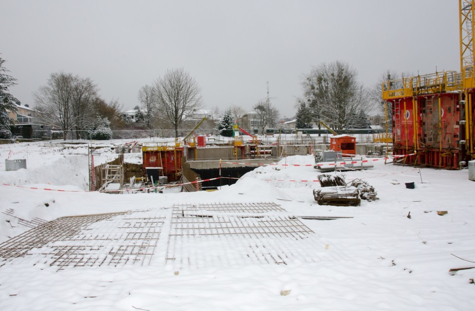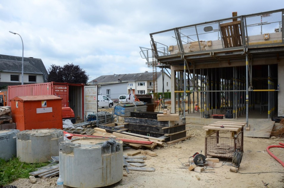 Les travaux de terrassement ainsi que le radier étant déjà finalisés, actuellement on finalise le coulage des voiles au sous-sol ainsi que le coffrage pour la dalle sur le sous-sol. Parallèlement, il est prévu de bientôt entamer les travaux de démolition de l’ancien bâtiment de l’école préscolaire. Malheureusement, les intempéries du début de février 2018 ont freiné l’avancement des travaux de gros-œuvres.