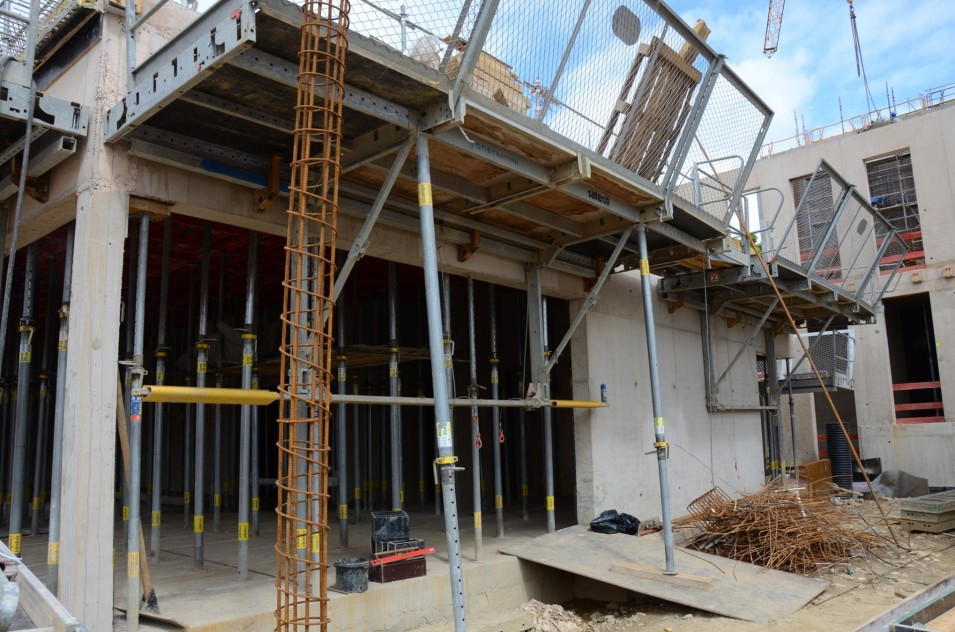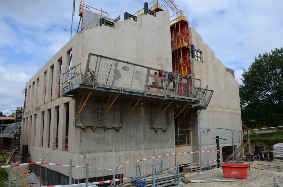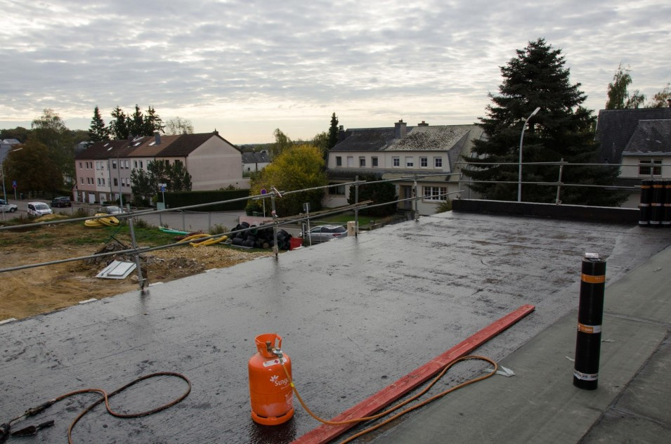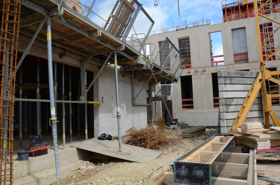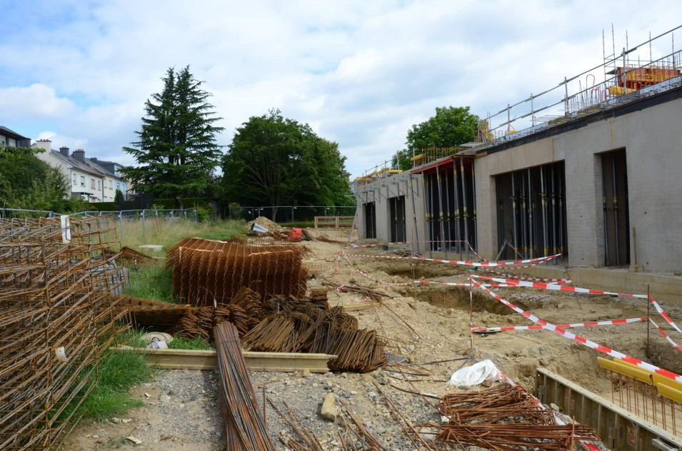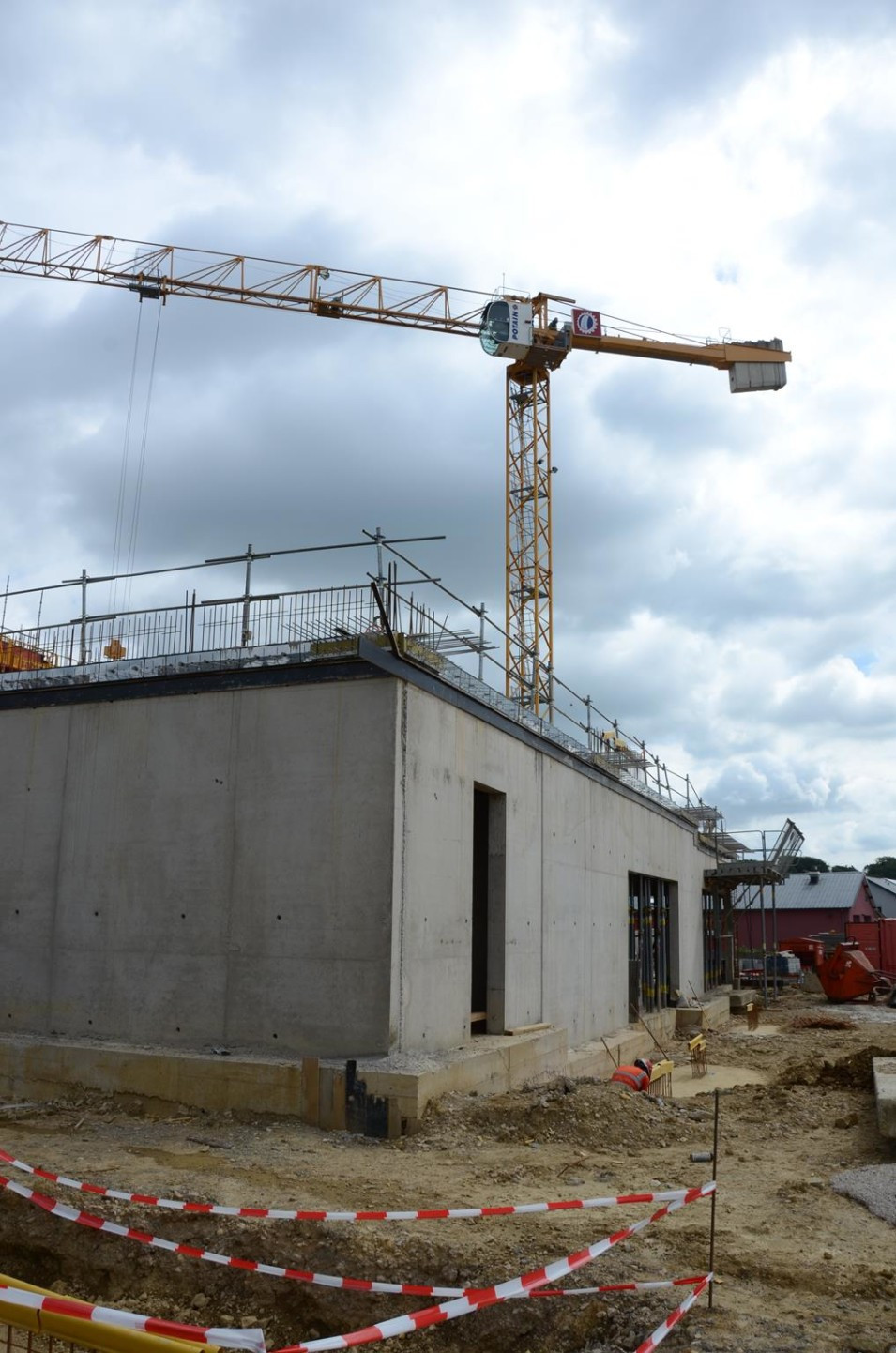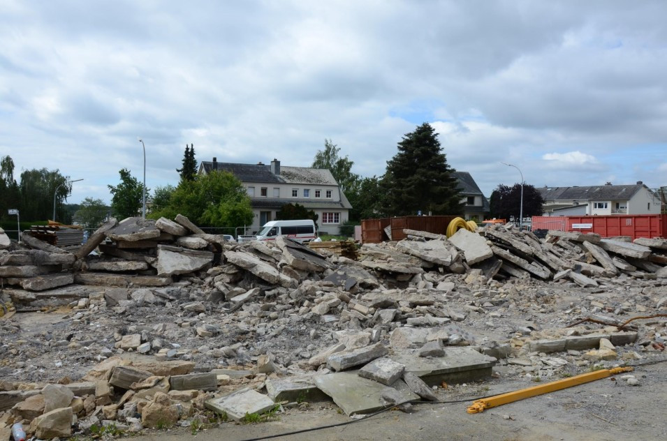 Les travaux de terrassement ainsi que le radier étant déjà finalisés, actuellement on finalise le coulage des voiles au sous-sol ainsi que le coffrage pour la dalle sur le sous-sol. Parallèlement, il est prévu de bientôt entamer les travaux de démolition de l’ancien bâtiment de l’école préscolaire. Malheureusement, les intempéries du début de février 2018 ont freiné l’avancement des travaux de gros-œuvres.